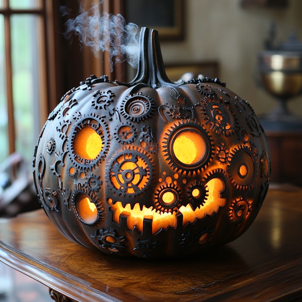 Prompt: A jack-o'-lantern with gears and cogs carved into its surface, emitting a soft, steam-like glow from its "eyes" and "mouth." The pumpkin might have metallic accents or copper textures.Get starting with Generative AI