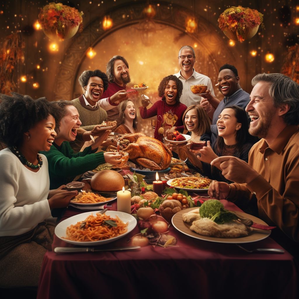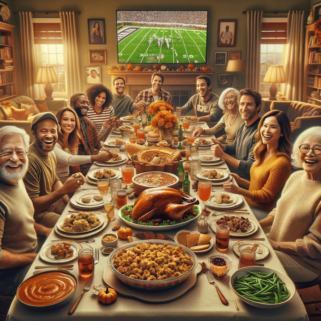 Prompt: Create an 8k, high-resolution, highly detailed photo depicting a joyful Thanksgiving dinner scene. The table is adorned with a bountiful feast, featuring a golden-brown turkey at the center, surrounded by classic sides like stuffing, cranberry sauce, green beans, and pumpkin pie. A group of people of various ages and diverse appearances are gathered around the table, smiling, laughing, and engaging in cheerful conversation, embodying a sense of happiness and togetherness. In the background, a television is on, displaying a live football game, adding to the festive and lively ambiance of the room. The room is warmly lit and decorated with Thanksgiving-themed ornaments, creating a cozy and inviting atmosphere.Generative AI tip of the week