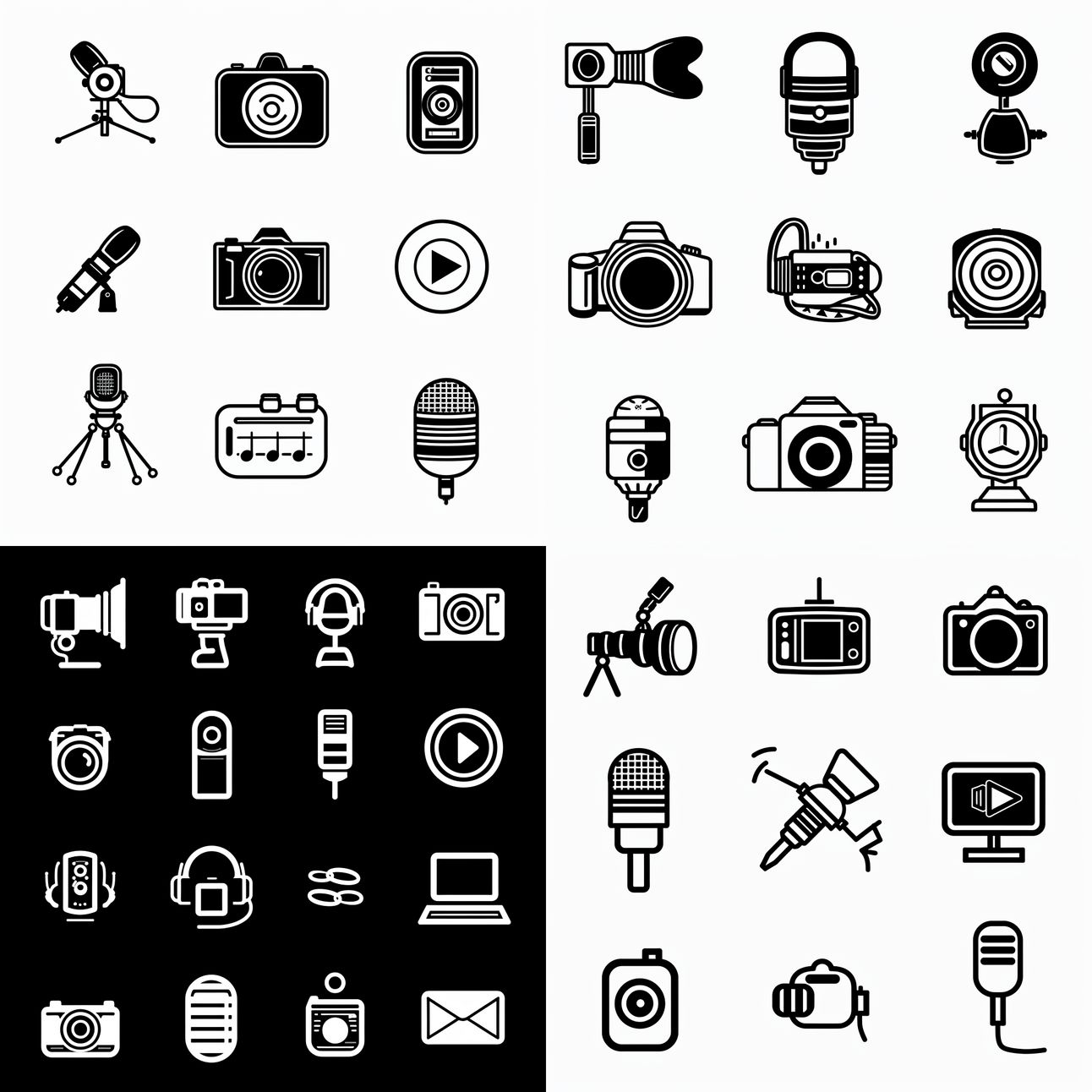 Prompt: create a set of icons representing photography, videography, audio editing, podcasting. make them simple designs and black and white only Generative AI tip of the week