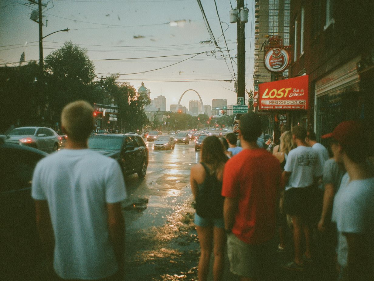 Prompt: Ultra-realistic analog photography, afternoon in St Louis. A group of people is waiting to cross an intersection on their way to a baseball game. The St. Louis arch is visible in the background The photo is captured on medium format film using a Holga 120N toy camera with its standard 60mm plastic lens. The aesthetic is authentic lo-fi analog: the focus is soft in the center and significantly blurred with optical distortion towards the edges. The colors are natural and realistic film tones, with low contrast and a slightly muted, organic palette. A subtle, natural optical vignette darkens the corners gently. The texture is raw and organic, featuring noticeable film grain, dust specks, and minor film scratches.What we found