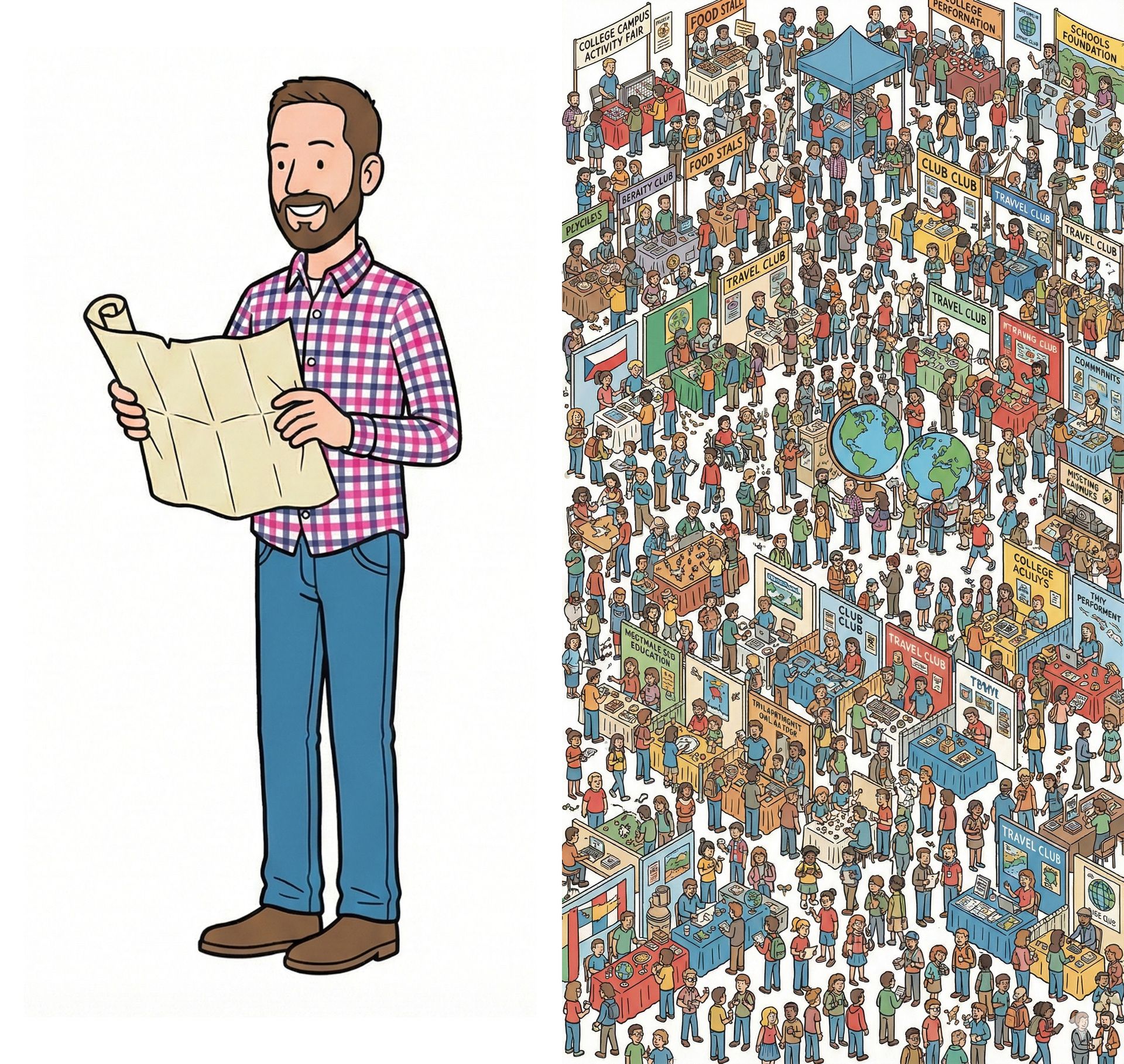 Prompt: A full-body character design sheet in the style of Martin Handford’s "Where’s Waldo." The character is in the attached image. The art style must feature thin, clean black ink outlines, flat vibrant colors, and a slightly lanky, cartoonish anatomy. The character should be shown in 3-4 different candid poses (walking, waving, looking confused, holding an object). No shading or gradients; use a minimalist, 2D hand-drawn aesthetic on a plain white background.Prompt: A sprawling, ultra-detailed isometric "Wimmelbilder" illustration in the signature "Where's Waldo" art style. The scene is a college campus activity fair.