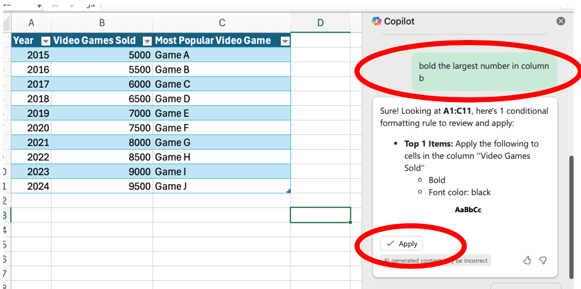 Writing formulas in Excel - We used to Google Excel formulas and struggle to get them to work. Now we tell Copilot in plain language what we want to do (bold the largest number in column b), and it does it.