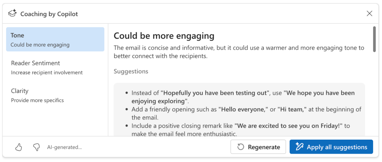 I asked Coach to rewrite the above paragraph, and here is what it wrote: “We often write emails, but sometimes we need a little help to ensure they are perfect. Writing emails is something we do often. However, we sometimes come across as too direct. That's why we use "Coaching by Copilot" to give a first read of our important emails before sending. Coach helps us improve tone, reader sentiment, and clarity to ensure our messages are effective and well-received. And it consistently helps us sound friendlier and more approachable. We love how it enhances our communication. This tool is invaluable in helping us communicate better and build stronger relationships.”