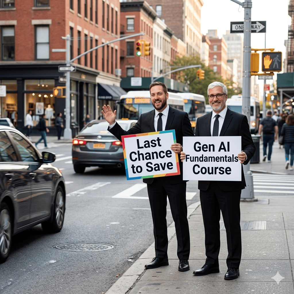 Prompt: These two men standing on a busy street corner near the curb and facing traffic. Each man is wearing a matching black suits and holding a large rectangular colorful business promotion sign in front of him, like people hired to attract attention for a sale. One sign clearly reads: “Last Chance to Save”. The other sign clearly reads: “Gen AI Fundamentals Course”. The men should look energetic, friendly, and attention-grabbing, as if they are promoting a business or special offer. Daytime, natural lighting, urban roadside setting, highly realistic, commercial photography style, clear readable text, full body view, wide shot, believable promotional marketing scene. Square photo.What we found