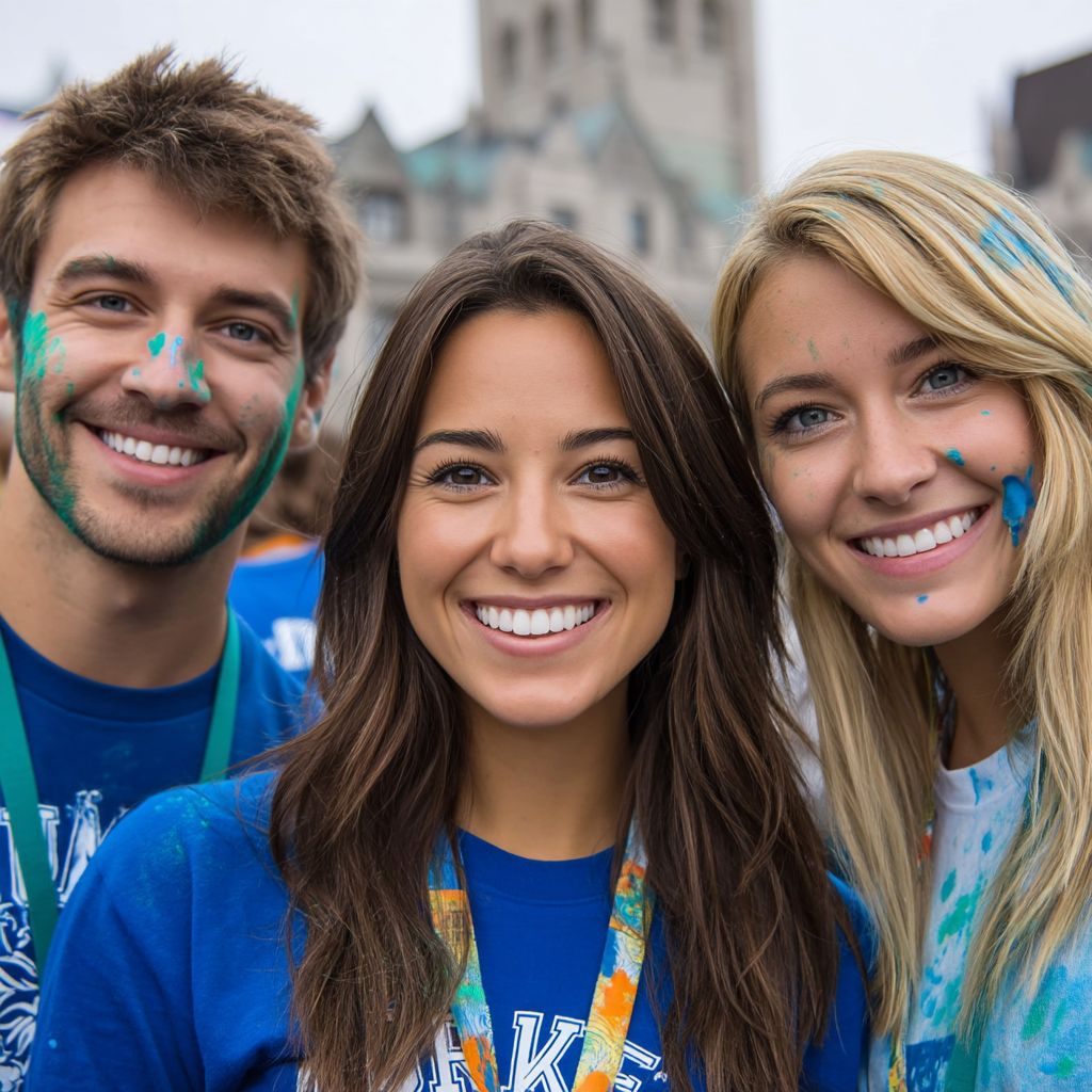 Prompt: college students with their faces and hair completely covered in various colors of paint after a paint fight broke out on the university campus, posing for a photo, wearing blue and white clothing that says Drake UniversityWhat we found