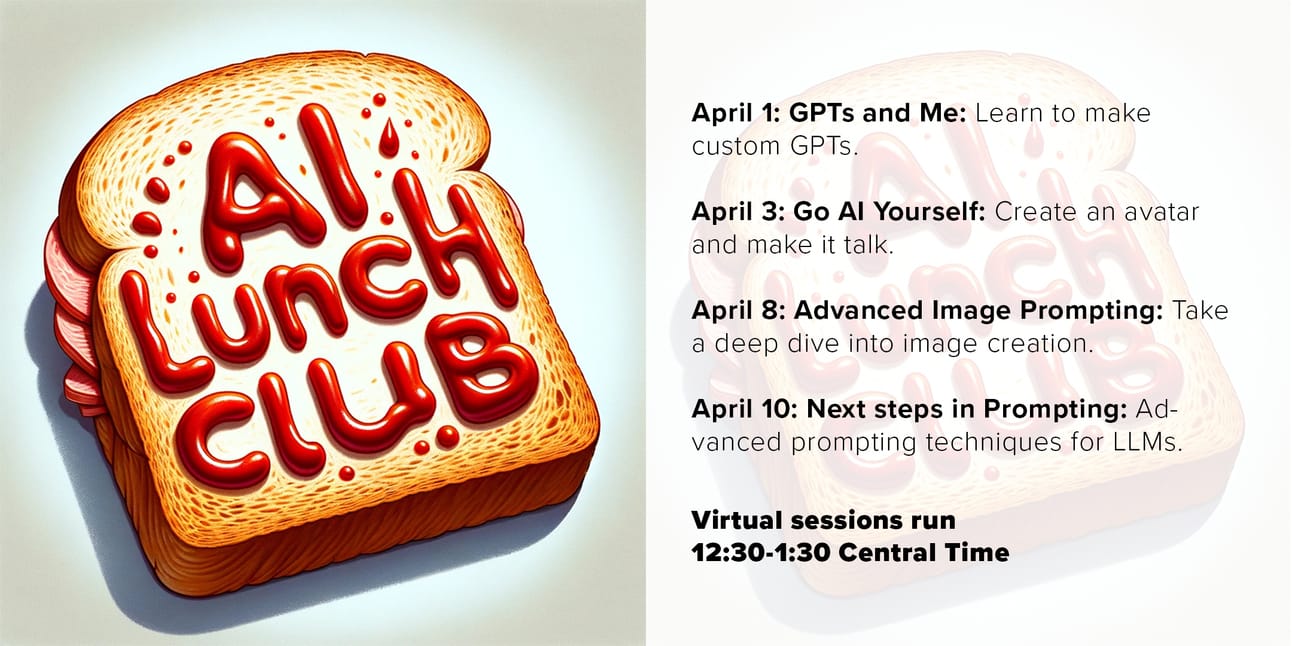 Want to go deeper into the subjects we talk about in our workshops? We’re doing just that in our new AI Lunch Club virtual events. These will take place over Zoom from 12:30-1:30 p.m. Central: