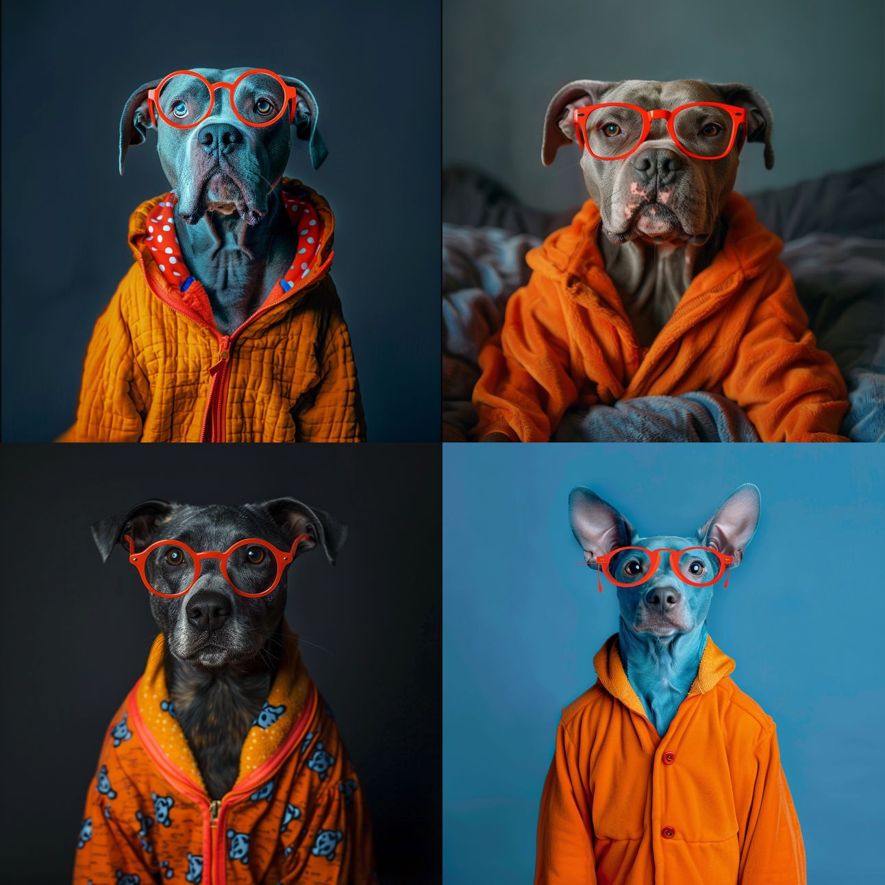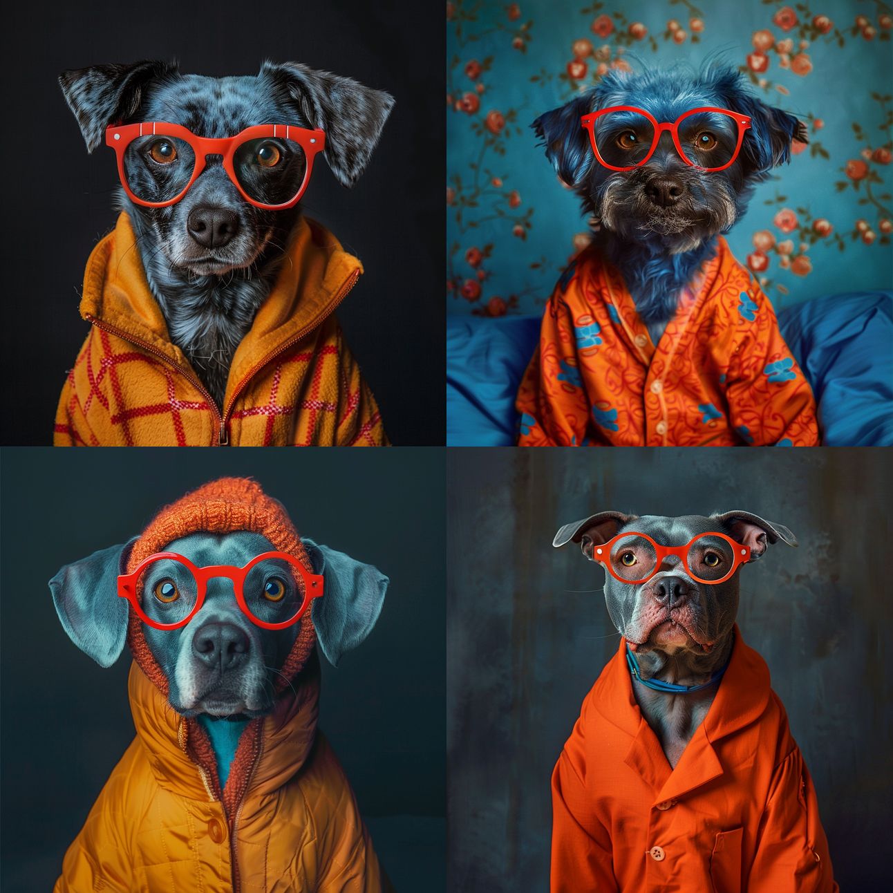 Prompt: award-winning photo of a blue dog wearing orange pajamas and red glasses