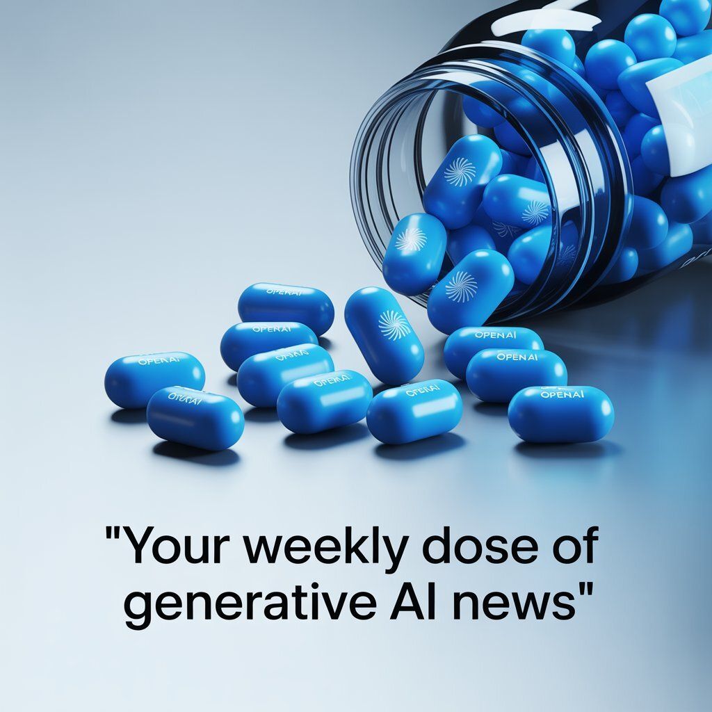 Prompt: Advertisement poster of small blue pills coming out of a bottle, the pills each have an OpenAI logo. Bottom text says "Your weekly dose of Generative AI news" in clean sans serif letters.What we found