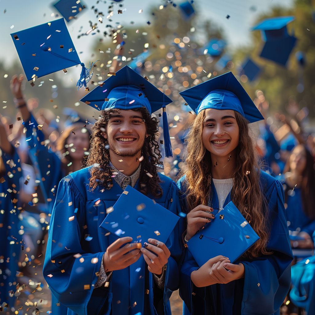 prompt: medium shot photo of two students holding their graduation caps in their hands, as students in the background throw their caps into the air, blue and white colors, highly-detailed, natural light --s 750 --no hatGenerative AI tip of the week: Write better prompts