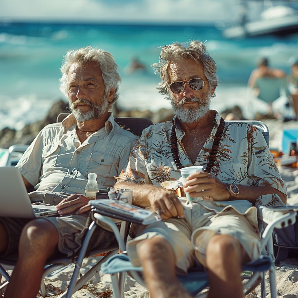 prompt: award-winning photograph of two 35-year-olds males - one with gray hair and short beard and one with brown hair and short beard - sitting in lawn chairs on the beach, wearing hawaiian shirts and shorts, working on their laptops, wide shot, Kodak Porta 800 Film --s 750 Generative AI tip of the week: Video editing