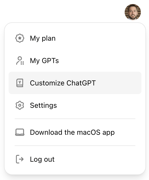 Click on your image in the upper-right corner and then choose “Customize ChataGPT” to get started. You can tell ChatGPT what you want it to know and how it should respond.