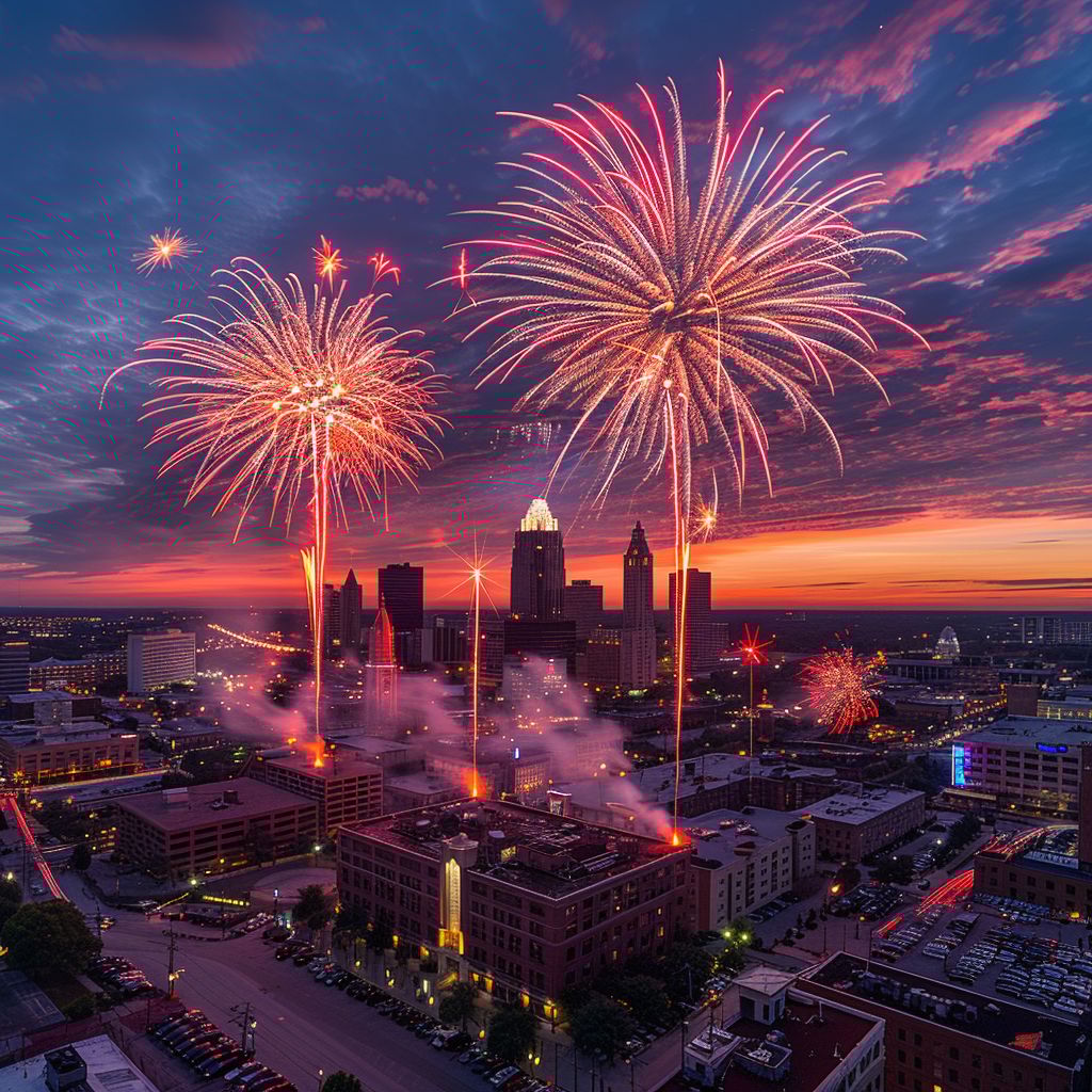 prompt: professional photo of fireworks in downtown Des Moines, HDR, cinematic, Drone Shot, Canon EOS 5D MARK IVGenerative AI tip of the week