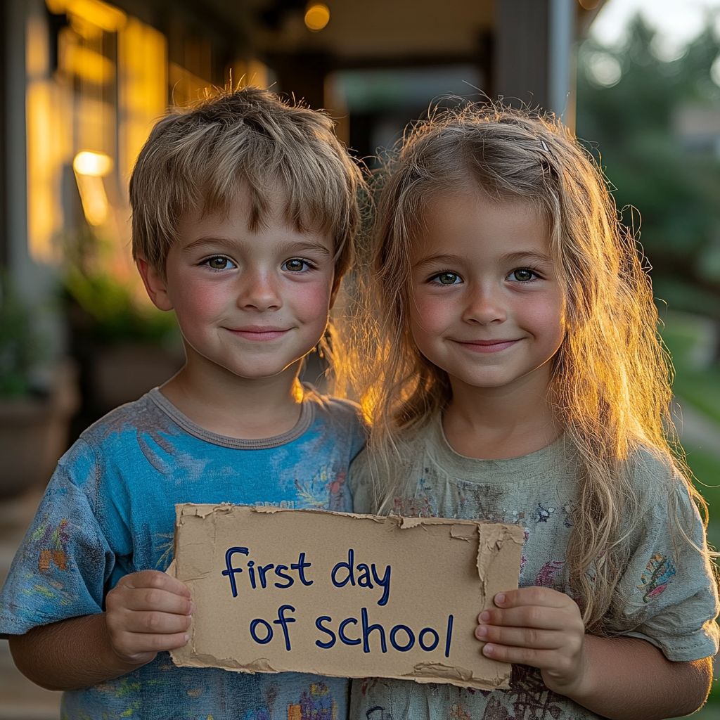 prompt: award-winning modern photo of two kids standing on their front porch to commemorate the first day of school, kids are smiling and holding a sign that says "first day of school", warm morning sunlight illuminates the kidsGet starting with Generative AI