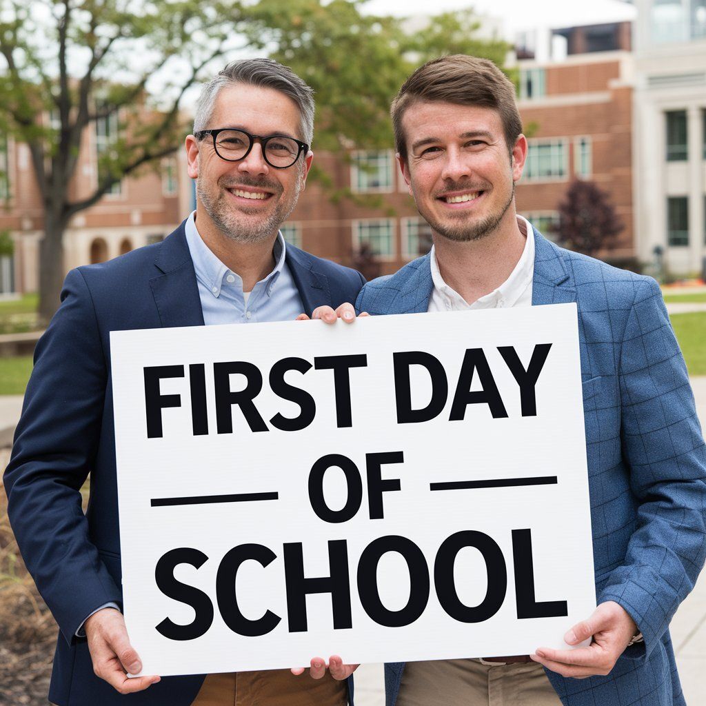 prompt: A photo of two 45-year-old male college professors posing for a photo on the first day of school. One professor has gray hair, a shortbeard, and glasses. The other professor has brown hair, a short beard, and does not wear glasses. They are holding a large sign that says "First day of school". The background is a college campus with trees and buildings.Get starting with Generative AI