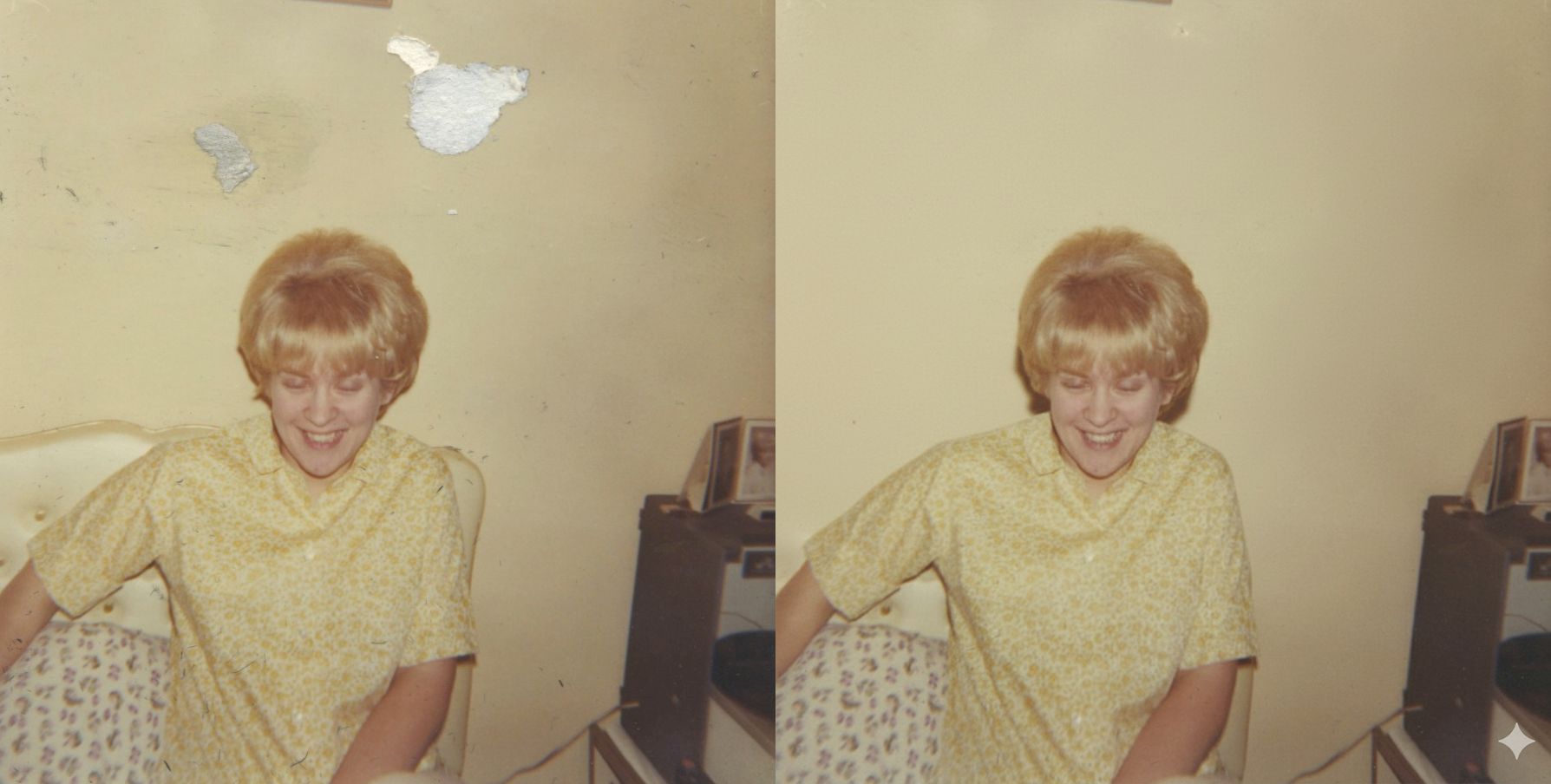 We tried it out for our image of the week below. But we’ve tested it in a couple other areas as well. Professor Snider asked Nano Banana to complete the five things he teaches in his intro to Photoshop class. And below he used it to restore a photo of his mom (with just the prompt “restore this photo”).