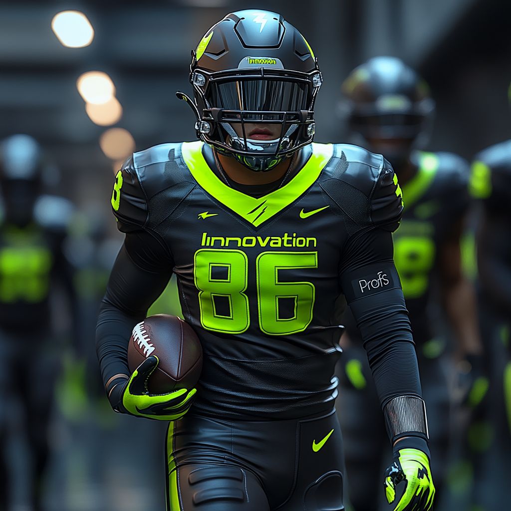 prompt: futuristic uniforms for a football team called the "Innovation Profs", colors are black and lime green, logo is a lightning bolt, high-resolution, 8k, photographyGet starting with Generative AI
