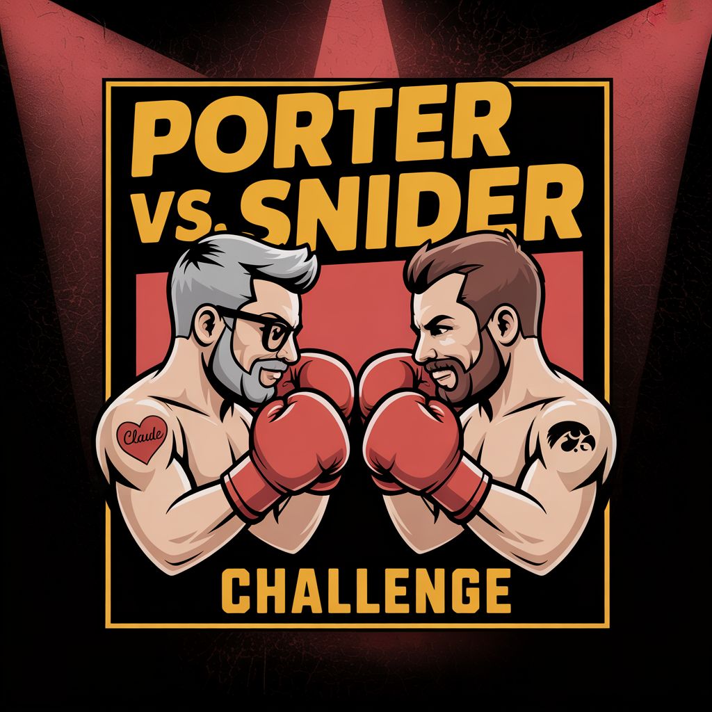 create a boxing poster-style logo for an event. It should say "Porter vs. Snider" in large letters and then "Challenge" smaller below that text. The logo should look like a sports event logo with bold lettering and vibrant colors. It should include cartoon-like images of two men facing each other with boxing gloves up - one young with short gray hair, gray beard and black glasses, one a little older with short brown hair and brown beard.I then went into Ideogram’s canvas editing tool and added tattoos (what boxer doesn’t need a tattoo). Porter’s tattoo shows his love for Claude and mine shows my fandom of the Iowa Hawkeyes.